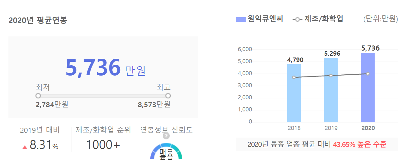 2020년 기준 평균 원익큐엔씨 연봉은 5800만원 수준